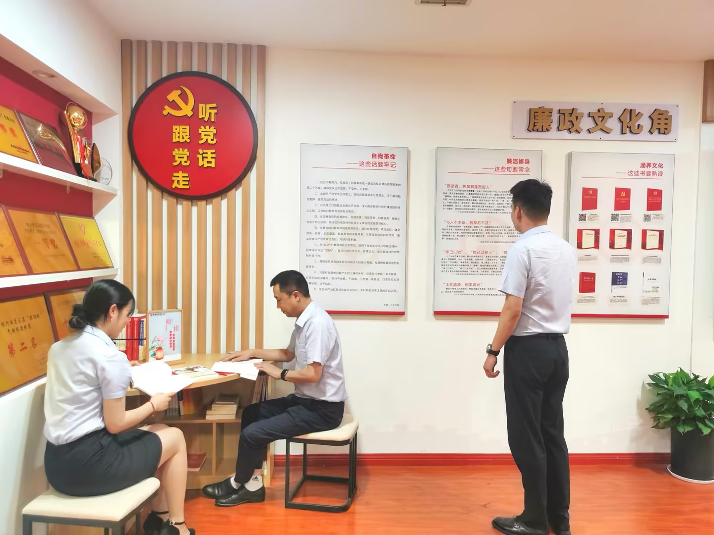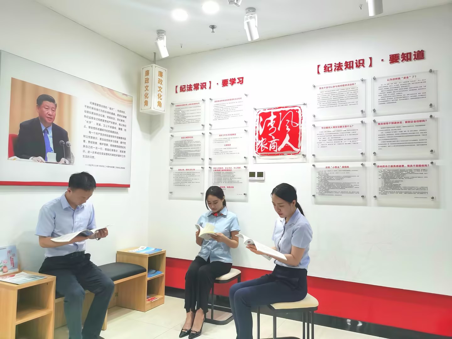 走进株洲农商银行办公楼,二、三、四楼各具特色的“廉政文化角”十分亮眼,“清风农商人”“听党话 跟党走”“把好金融方向盘 系好廉洁安全带”“践行廉承诺 实现行风清”等崇廉尚洁的标识牌赫然醒目,在每一个“廉政文化角”都摆有不同风格的小桌子、小凳子,并配有廉洁书籍、读本。“自从有了廉政文化读书角,大家经常聚在这里交流学习。我最喜欢看廉洁文化故事,让人感慨!让人警醒!” 小何手捧《清风》杂志分享了自己的阅读感悟。株洲农商银行深挖清廉金融文化内核,精准定位,将清廉金融文化与本行工作实际相结合,突出亮点,聚焦“清”“正”“廉”“洁”文化理念,精心打造清廉金融文化宣传品牌,在丰富职工精神文化生活的同时,以清廉文化不断滋养新风正气。